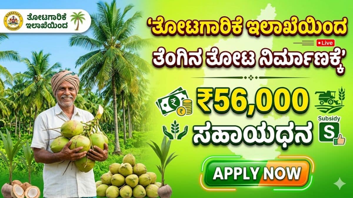 ಕರ್ನಾಟಕದಲ್ಲಿ ಕೃಷಿ ಕ್ಷೇತ್ರವನ್ನು ಉತ್ತೇಜಿಸಲು Karnataka Horticulture Department ಮಹತ್ವದ ಯೋಜನೆಯನ್ನು ಜಾರಿಗೆ ತಂದಿದೆ. ತೆಂಗಿನ ತೋಟ ನಿರ್ಮಾಣಕ್ಕೆ ರೈತರಿಗೆ ₹56,000 ವರೆಗೆ ಸಹಾಯಧನ ನೀಡಲಾಗುತ್ತಿದೆ. ಇದು ವಿಶೇಷವಾಗಿ ಸಣ್ಣ ಮತ್ತು ಮಧ್ಯಮ ರೈತರಿಗೆ ದೊಡ್ಡ ಸಹಾಯವಾಗಲಿದೆ.